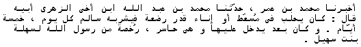 - Muhammad Ibn ‘Umar told us : Muhammad Ibn ‘Abdullah, Az-Zuhri’s nephew, told us on the authority of his father that he said : an amount of one milk drink was collected in a pot or glass, so Salim used to drink it every day, for five days. After this, he used to enter while her head is uncovered. This was permission from Messenger of Allah to Sahla bint Suhail.